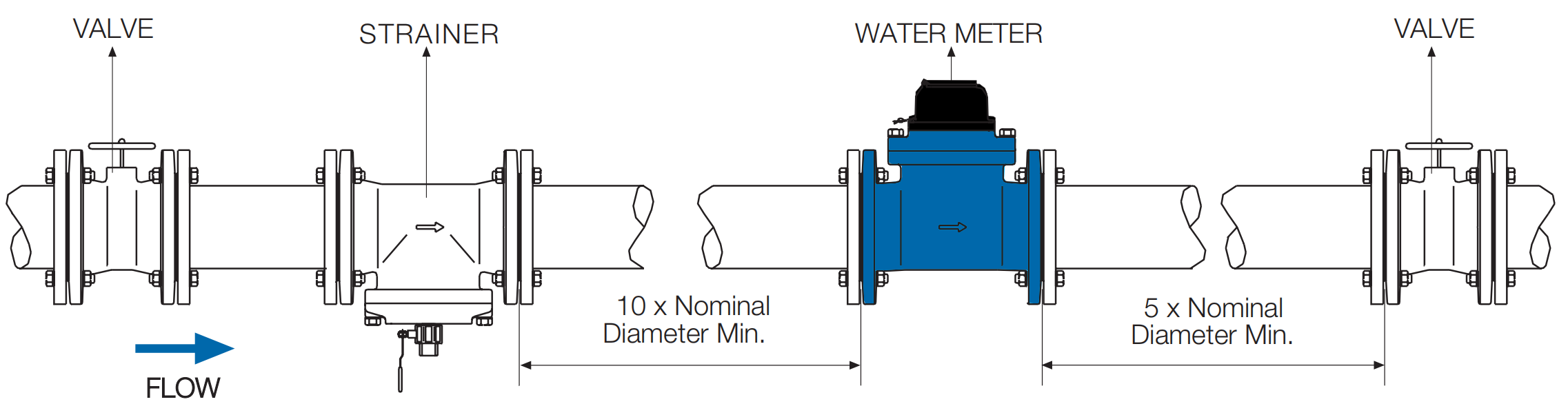 Straight pipe or flow conditioners must be installed both upstream and downstream of the water meter, normally in accordance with the U10D5 requirement. In cases where swirling flow is caused by bends or centrifugal pumps, a flow conditioner must be installed before the straight pipe.